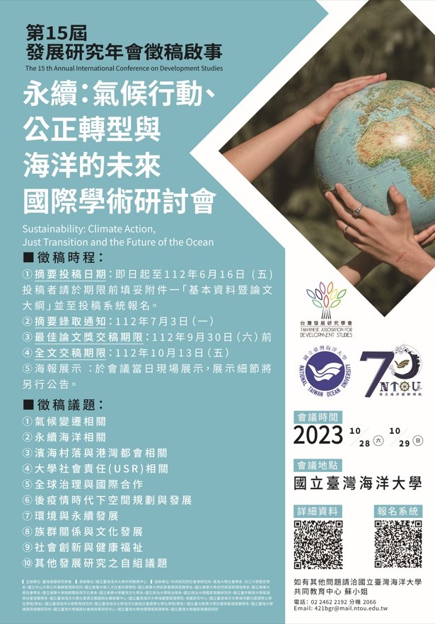 第十五屆發展研究年會「永續:氣候行動、公正轉型與海洋的未來」摘要收件延長至 06 / 23!